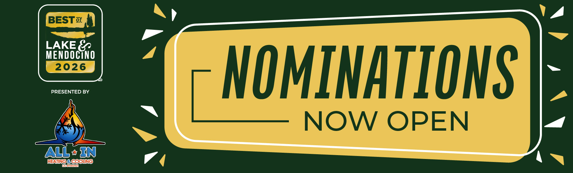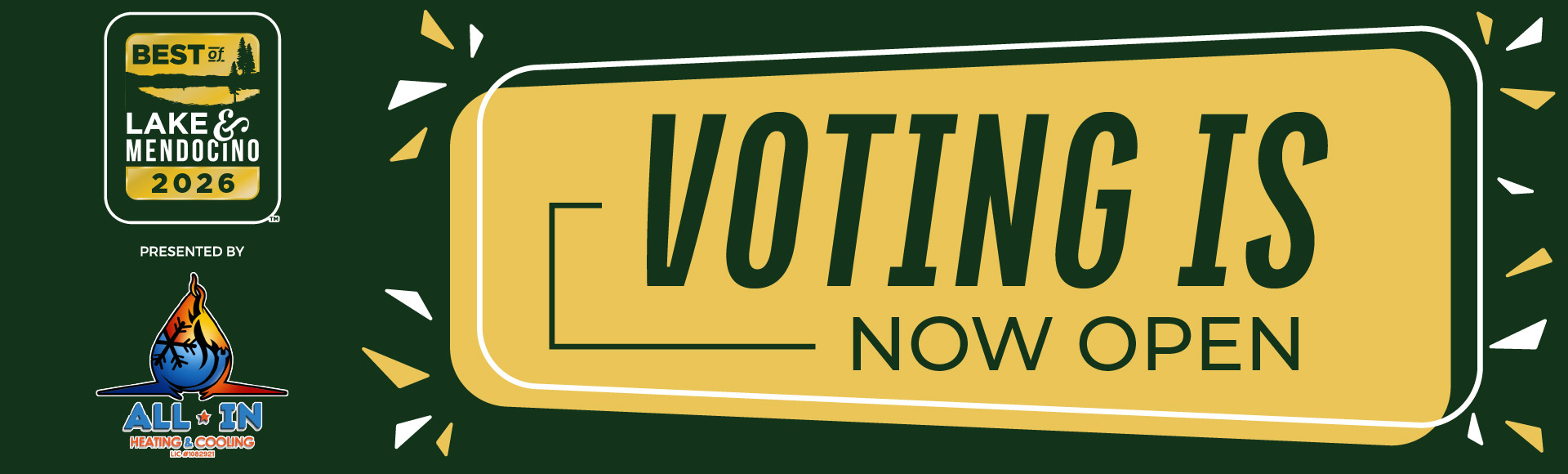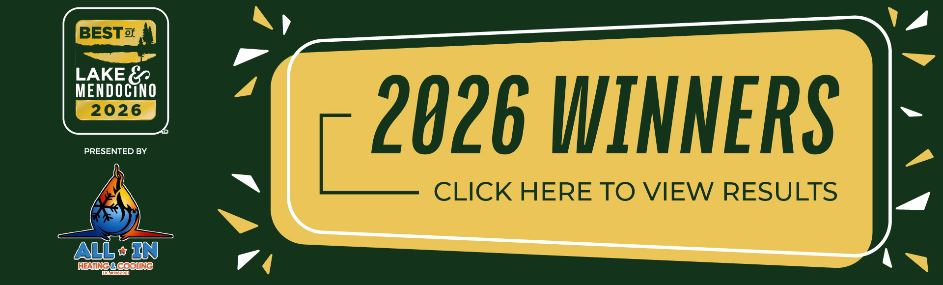 Nominations starts in ... Submit Your Nomination! Voting starts in ... Voting Starts Here! Results will be published in ... Your Best of Lake and Mendocino 2026 Winners Select categories below to view winners! Activities & Entertainment Business & Professional Services Food & Beverage General Services Home & Garden Lifestyle & Beauty Medical Shopping Vehicles & Services Wine