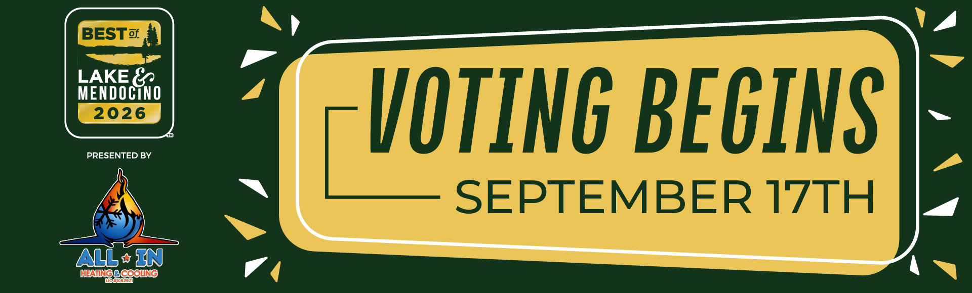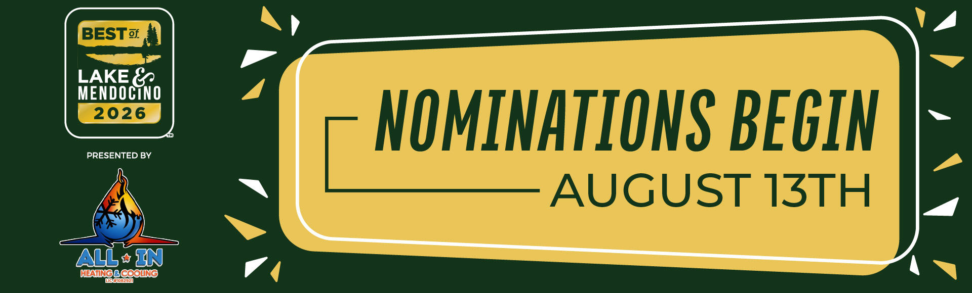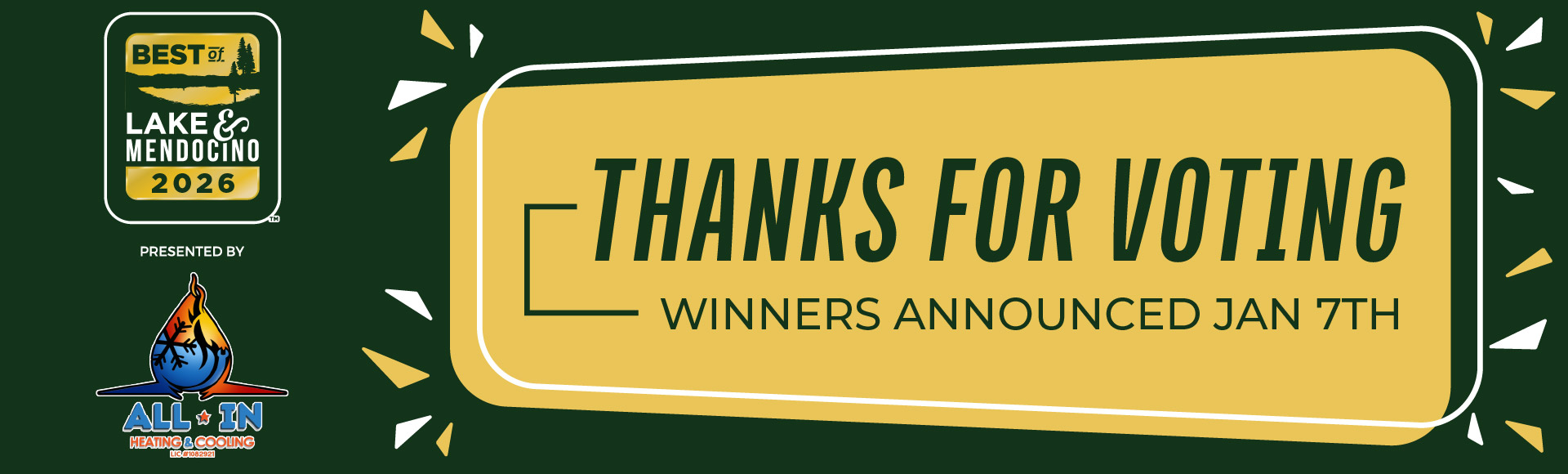 Nominations starts in ... Submit Your Nomination! Voting starts in ... Voting Starts Here! Results will be published in ... Your Best of Lake and Mendocino 2026 Winners Select categories below to view winners! Activities & Entertainment Business & Professional Services Food & Beverage General Services Home & Garden Lifestyle & Beauty Medical Shopping Vehicles & Services Wine